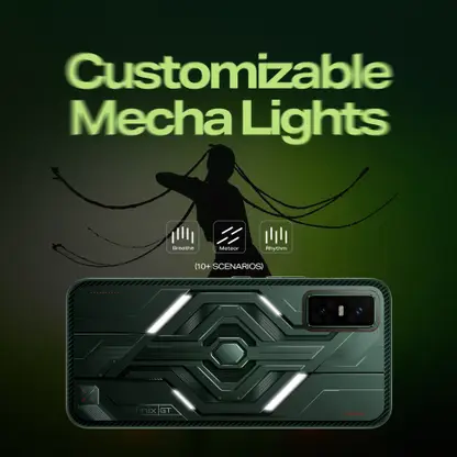 The Cyber Mecha 2.0 design exemplifies geometric precision and modern edginess, featuring bold diagonal lines that resonate with the distinct style of OG gamers. Tailored to gaming enthusiasts, the GT 30 5G+ is available in three striking design themes that embody the essence of gaming culture. Cyber Blue and Pulse Green introduce vibrant hues symbolizing strength and precision, while Blade White offers a clean, minimalist look with subtle yet engaging details. Futuristic accents in contrasting tones enhance the overall aesthetic, and customizable LED lights on the back panel add a dynamic touch, responding to actions like charging or music playback.